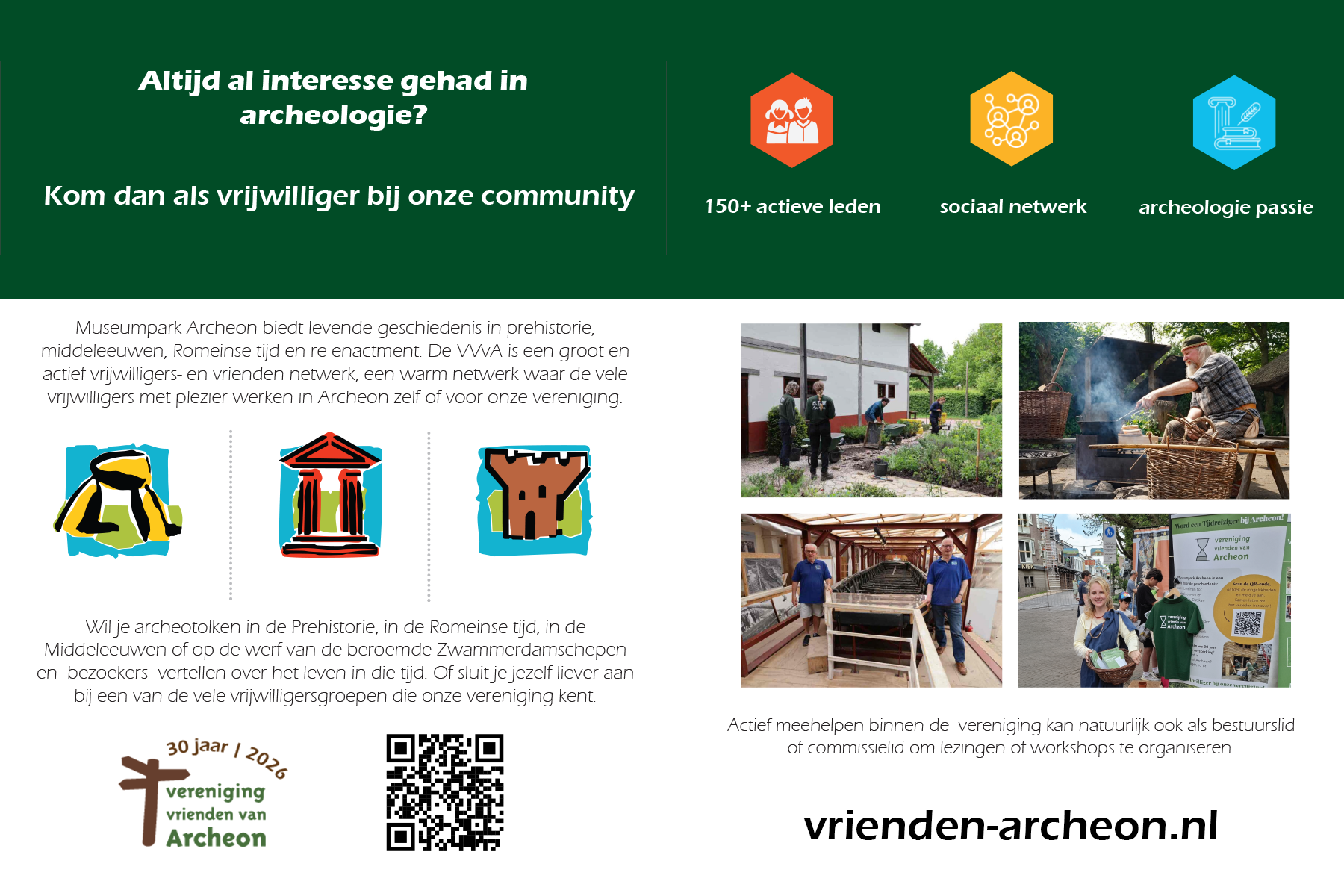 Onze vereniging bestaat in 2026 dertig jaar en groeit prettig door en daarom zijn wij op zoek naar vrijwilligers, bestuursleden en commissieleden om ons team van vrijwilligers te versterken. Doe je mee? Meer informatie over de werkzaamheden van VVvA vrijwilligers lees je hier: https://www.vrienden-archeon.nl/vrijwilliger-worden/