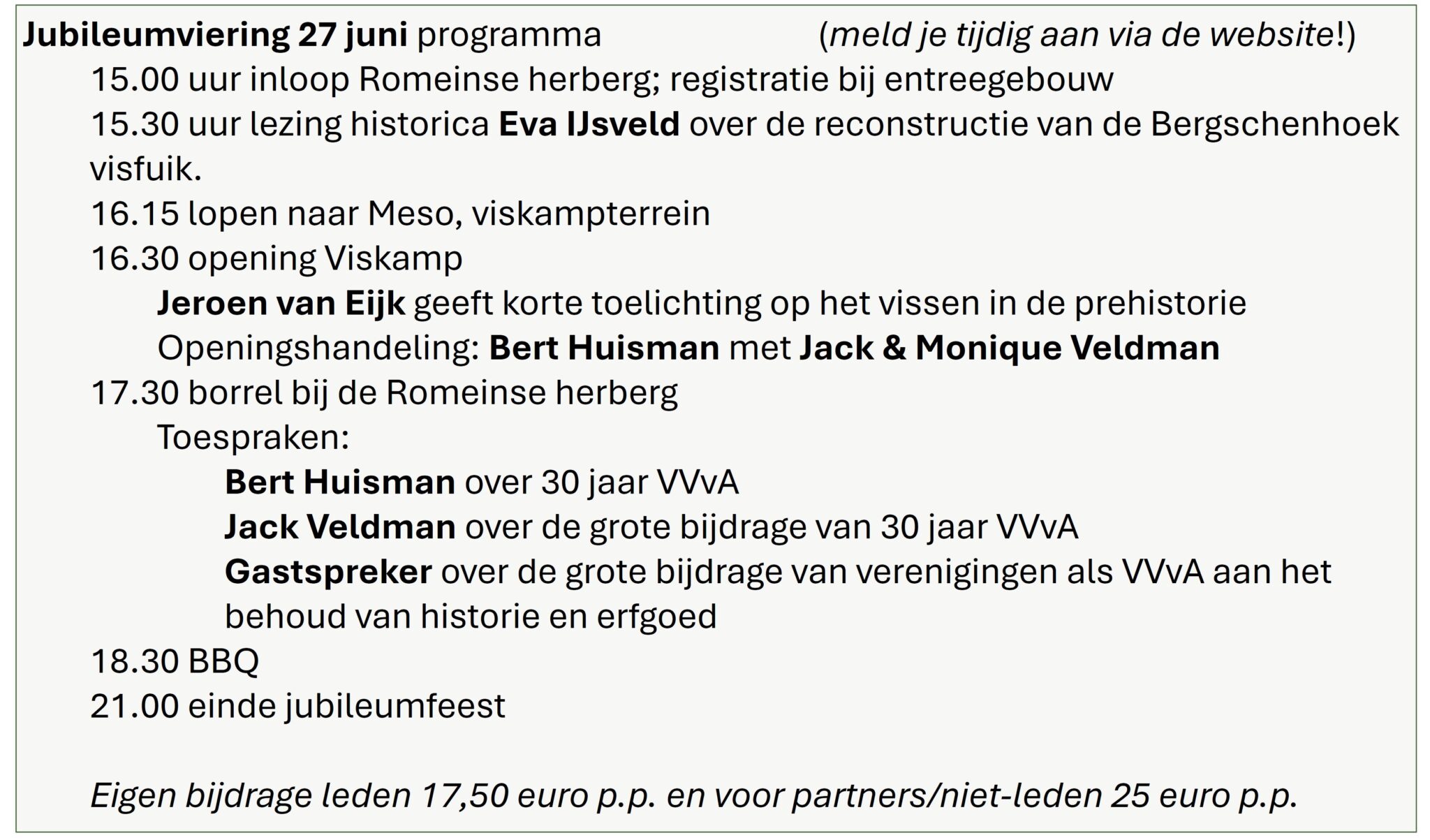 Tijdens de viering zullen we ons nieuwe prehistorische viskampje in de Meso officieel overhandigen aan Archeon. Een prachtig project dat onze passie voor erfgoed opnieuw zichtbaar maakt.